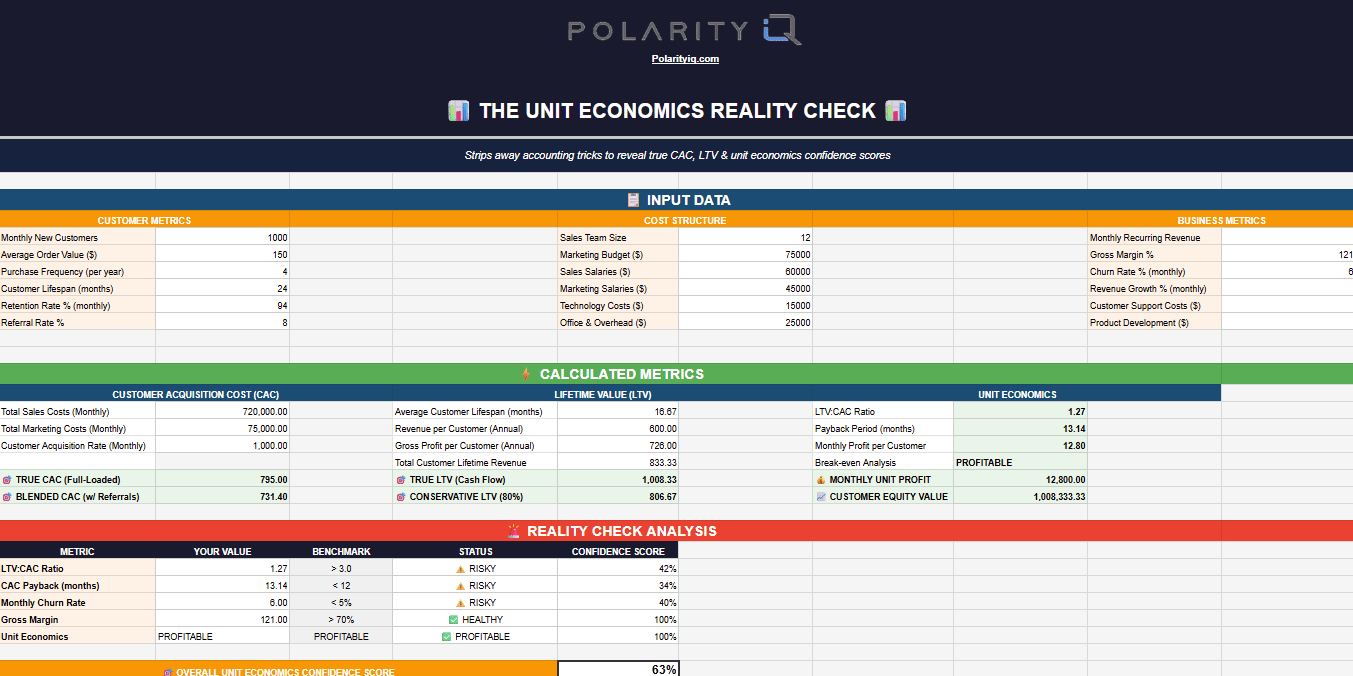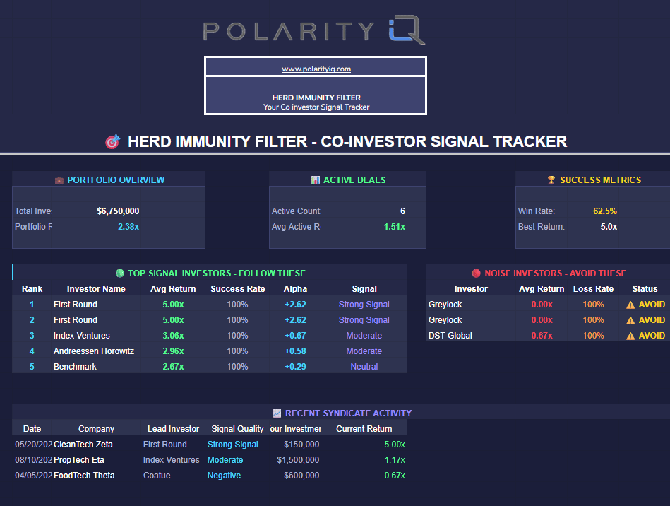 Private Markets Investor Catalyst Suite Contents1. Investment Blind Spot Tracker [Google Sheet + Word]What it does: You record 10–20 characteristics of failed investments, including founder background, business model, reasons for failure, and red flags that were ignored. The spreadsheet processes these entries to detect recurring patterns. 2. The Cognitive Bias Investment Filter [Excel + Word] What it does: A 15-question framework you answer when a deal is under consideration. The sheet scores the answers and maps them to bias checkpoints such as time pressure, social proof, and over-confidence. 3. Portfolio Diversification Checker / Portfolio Mirror [Google Sheet + Word]What it does: You enter portfolio attributes across 12 dimensions such as founder age, industry, business model, and geography. The sheet analyzes these fields and calculates a “sameness score”. 4. Conviction vs Allocation [Google Sheet + Word]What it does: You record a conviction rating from 1–10 for each position and your actual dollar allocation. The sheet compares the two. 5. Herd Immunity Filter [Google Sheet + Word]What it does: You tag deals by co-investors and track outcomes over time. The sheet aggregates results by co-investor. 6. Revenue Velocity Index [Google Sheet + Word]What it does: You input monthly revenue growth rate, sales cycle length, and customer acquisition trends for the last 12 months. The sheet combines these into a single score and can benchmark by industry and stage. 7. Burn Multiple Predictor [Google Sheet + Word]What it does: You enter burn rate and revenue growth. The sheet evaluates growth efficiency by stage and sector and projects runway and funding requirements. 8. Unit Economics Reality Check [Google Sheet + Word]What it does: You calculate true CAC and LTV using cash-flow timing, fully loaded costs, and realistic churn assumptions. The spreadsheet applies time-tested assumptions and requires inputs that avoid optimistic accounting. Private Markets Catalyst Suite - The Complete GuideIn addition to the tools themselves, we’ve also prepared a comprehensive 10-page reference manual to further assist you in using PMICS effectively. This reference manual shows you exactly how and when to apply each tool, in what sequence, and at what cadence. It includes step-by-step playbooks for new deals, follow-ons, quarterly portfolio reviews, and syndicate checks. The guide also contains a one-page reference map linking each tool together. Bottom Line Catalyst Suite Value:
